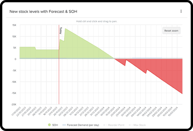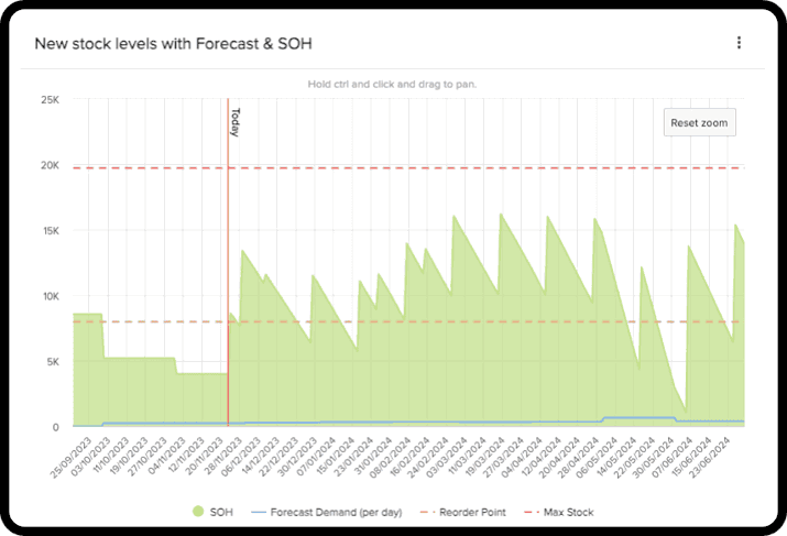 The final step in the process is to adjust the reorder point and maximum stock level controls for the beer product until the stockout risk is under control. Here, the burn-down chart shows a much more normal series of peaks in stock on hand – as orders arrive in the warehouse, followed by dips, as sales eat away at inventory. With a click, these inventory controls – the new minimum and maximum inventory levels – are submitted into the reordering system, so that purchase orders can be raised at the right times – and for the right quantities – to meet demand.